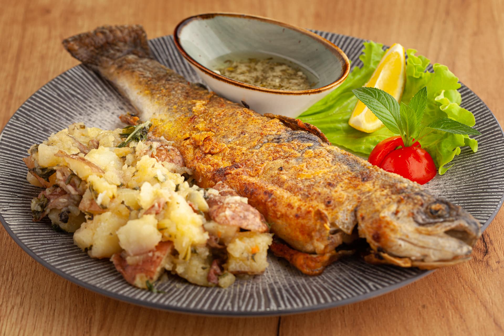 1 kg / portion is measured – Perch fillets in the Golubac style with roasted potatoes with Swiss chard and marinade