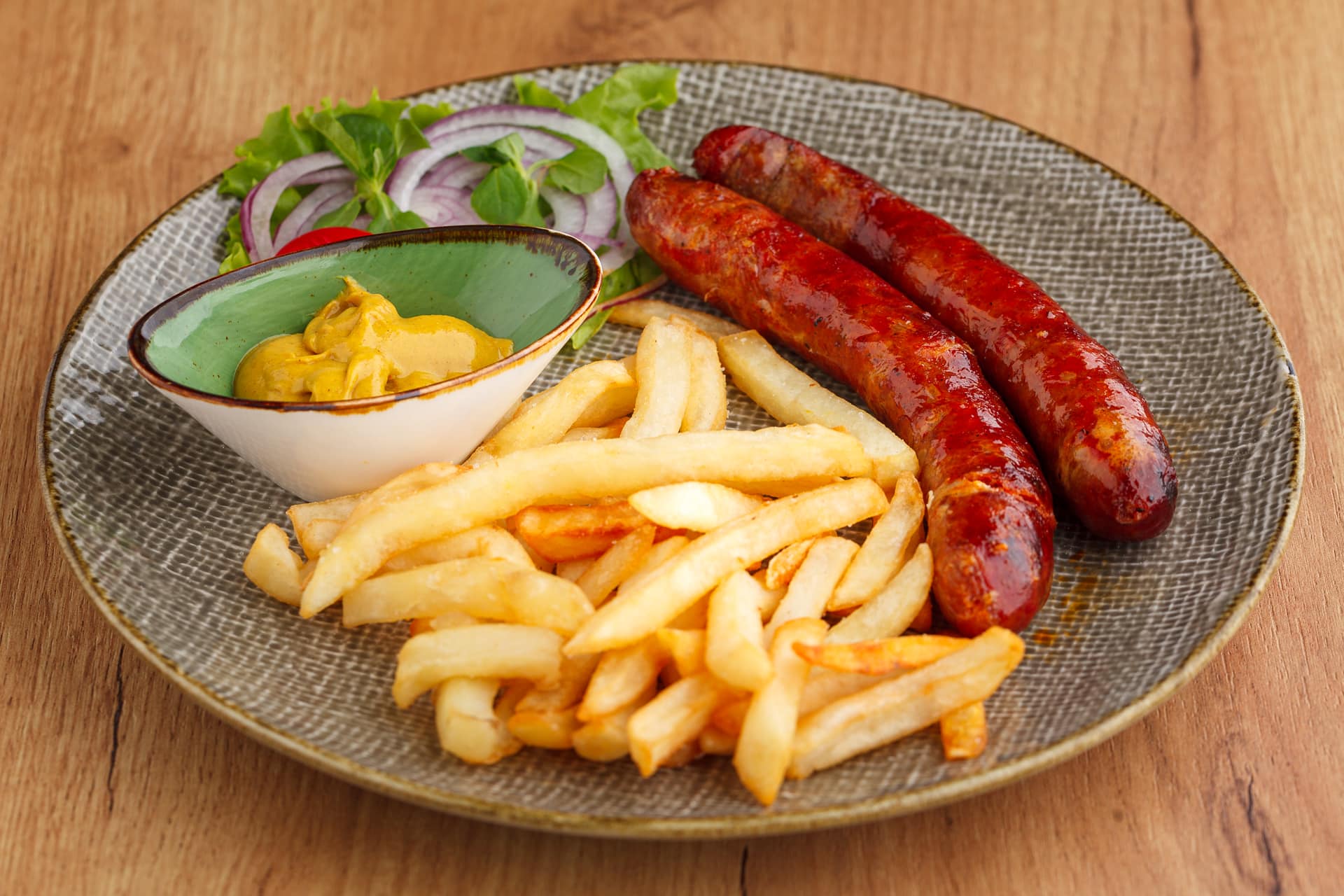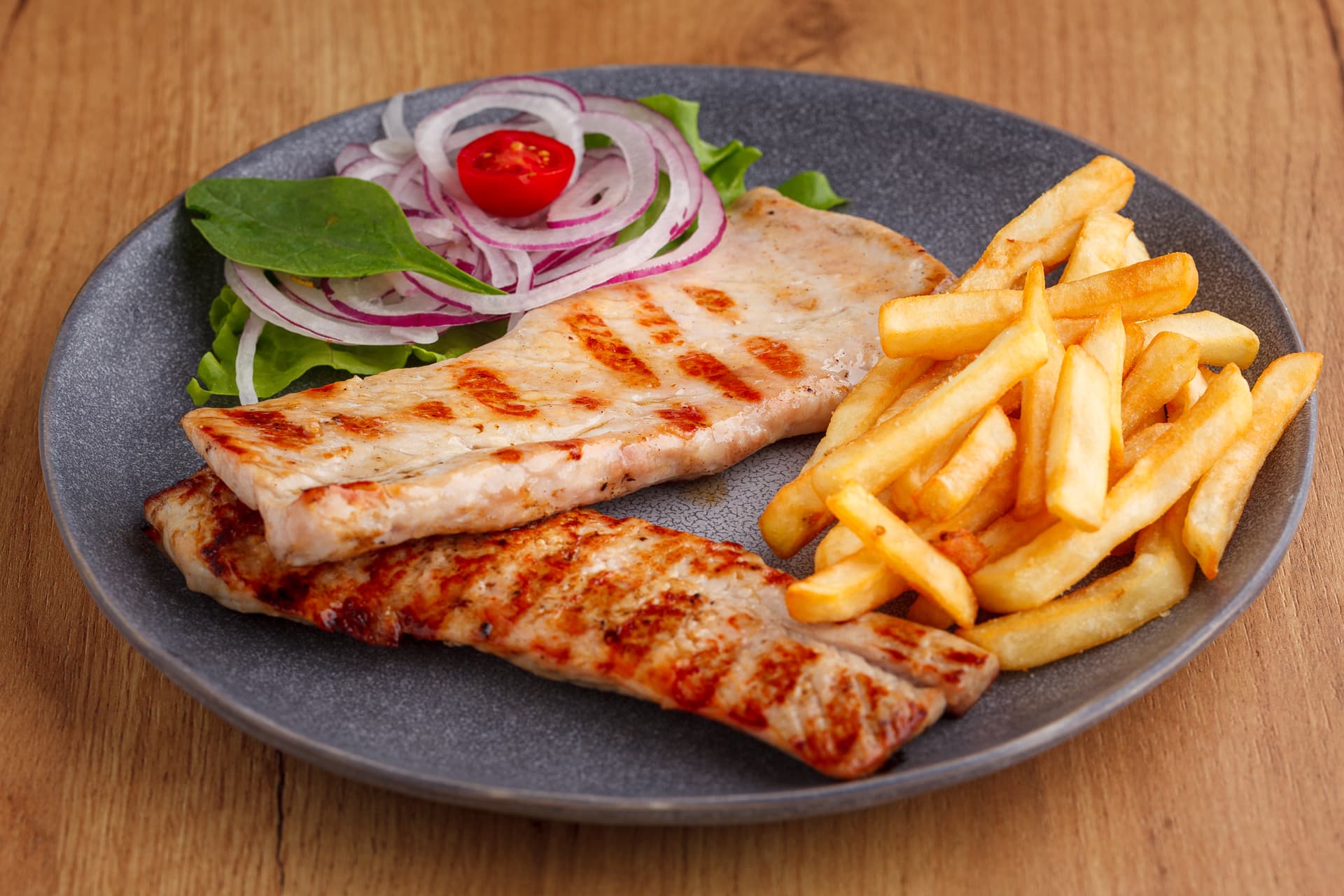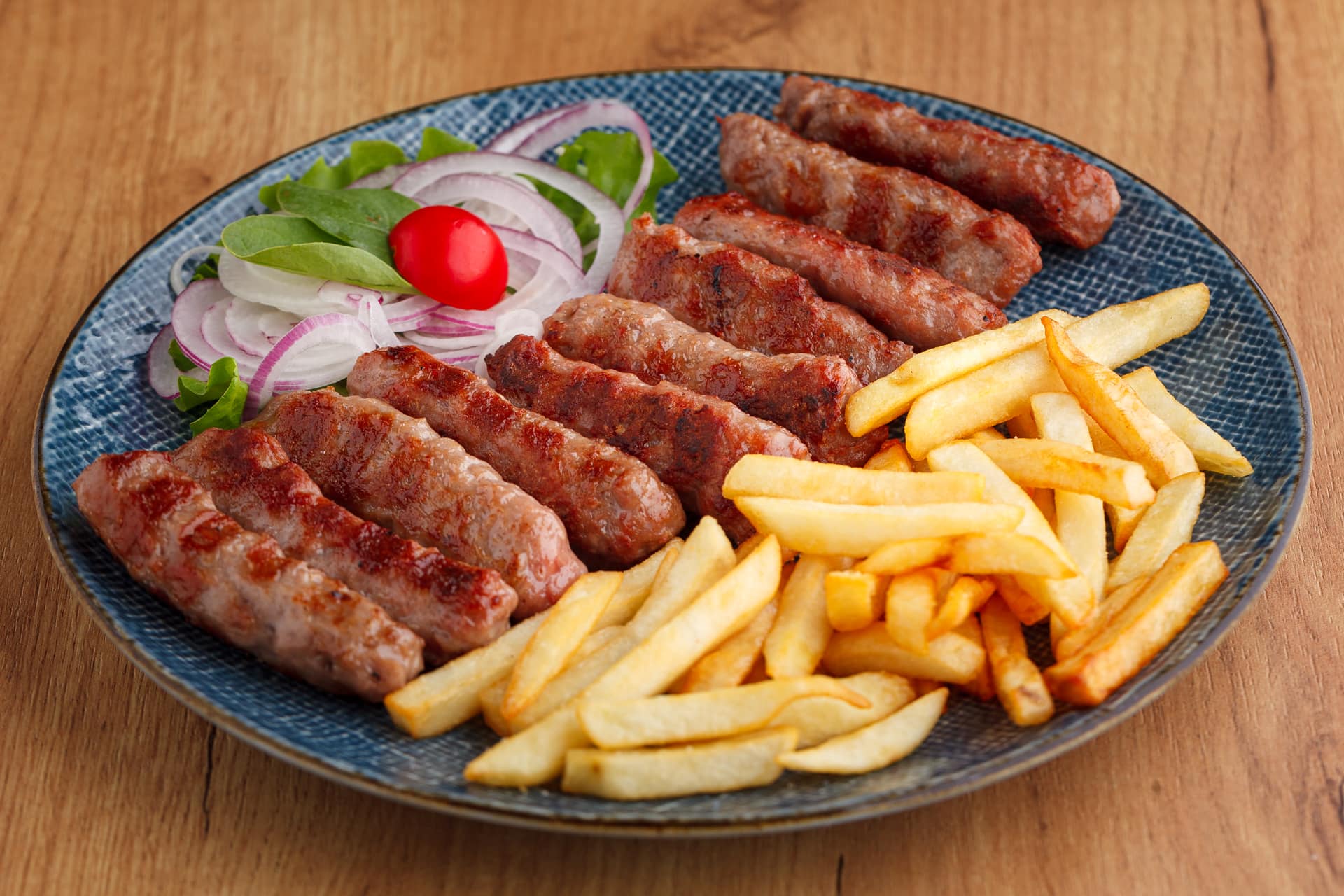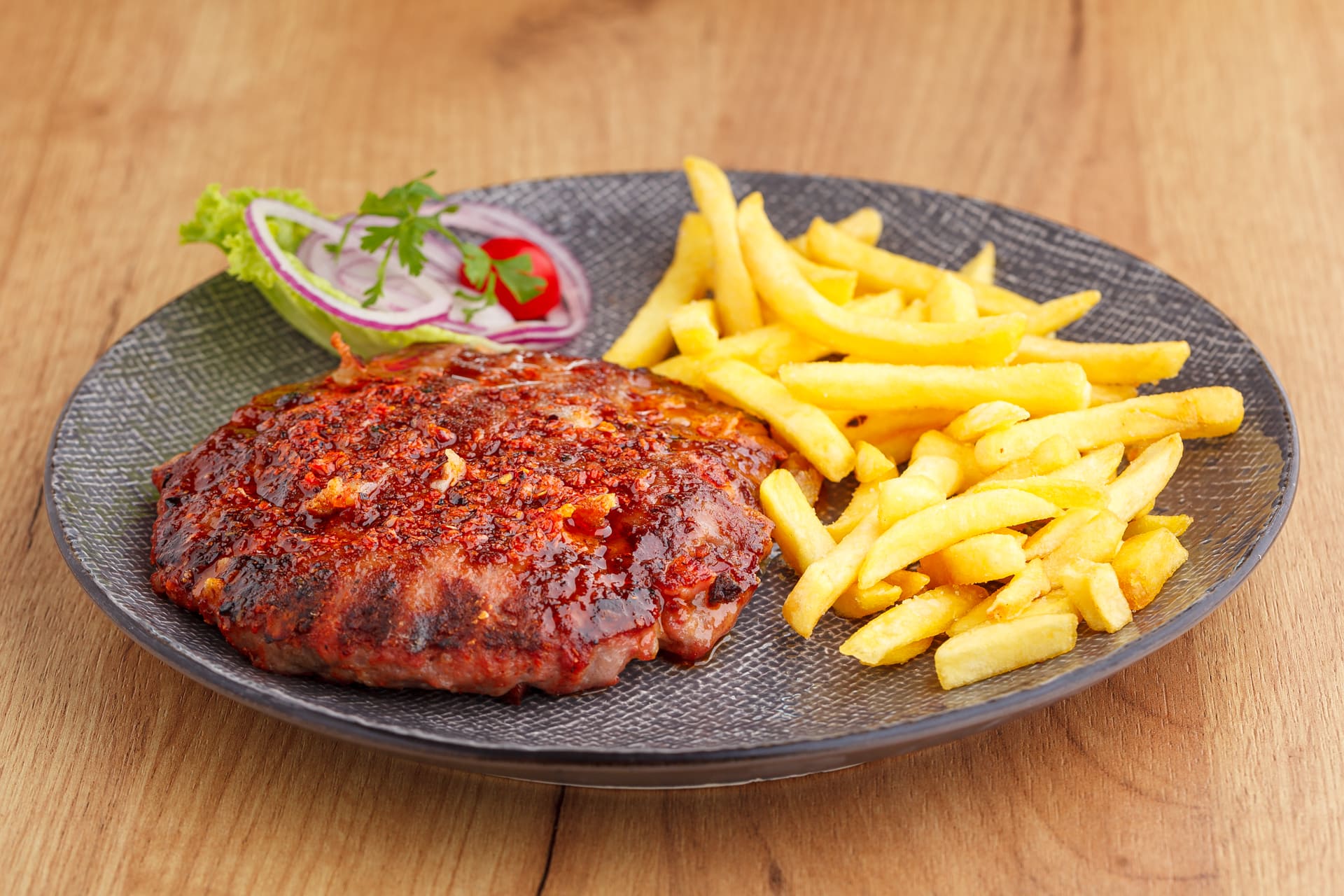 450g portion – Kebabs made of the highest quality homemade barbecue meat, grilled to perfection, french fries, onions