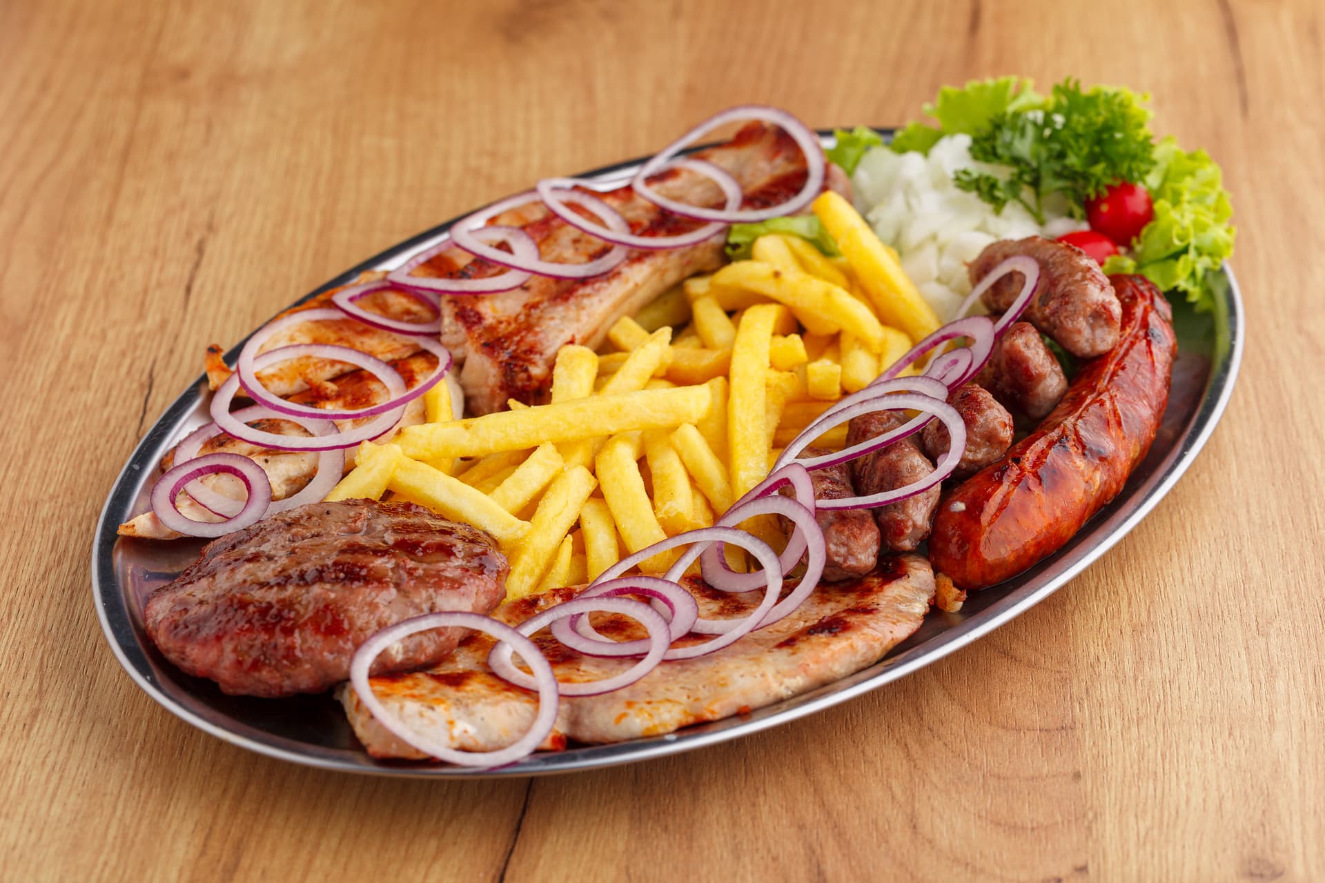 1,2Kg portion – Selected selection of mixed meat: smoked sausage, hanger, chicken fillet, burger, 5 kebabs, pork ribs, french fries, onion
