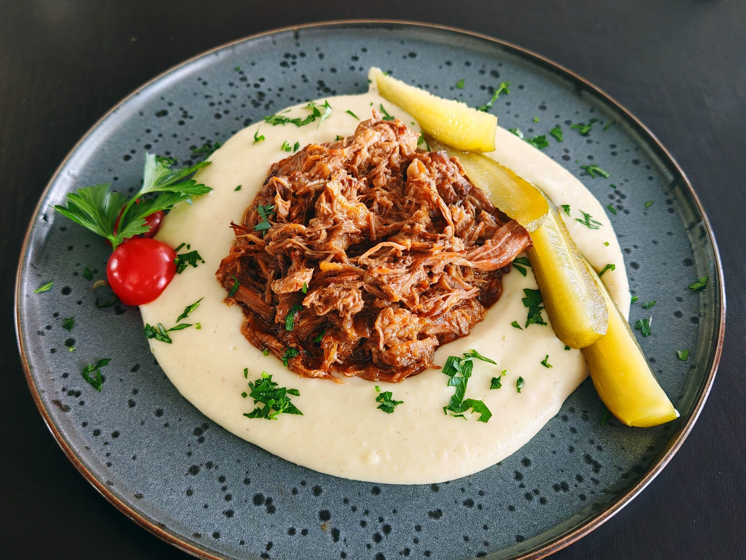 450g porcija – Sočni, začinjeni cepkani komadi najkvalitetnijeg svinjskog mesa servirani na krompir pireu